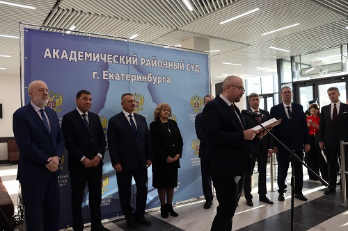 19 февраля 2025 года в торжественной обстановке в городе Екатеринбурге состоялось открытие нового здания Академического районного суда. В мероприятии приняли участие Губернатор Свердловской области Е.В. Куйвашев, Заместитель полномочного представителя Президента России в Уральском федеральном округе А.М. Калиберда, Председатель комитета Государственной Думы Российской Федерации по государственному строительству и законодательству П.В. Крашенинников, Председатель Законодательного Собрания Свердловской области Л.В. Бабушкина, Глава города Екатеринбурга А.В. Орлов, Председатель Свердловского областного суда В.А. Дмитриев, Заместитель Генерального директора Судебного Департамента при Верховном Суде Российской Федерации Е.Ю. Игнащенко, представители государственных силовых структур и ведомств, председатели судов г. Екатеринбурга.